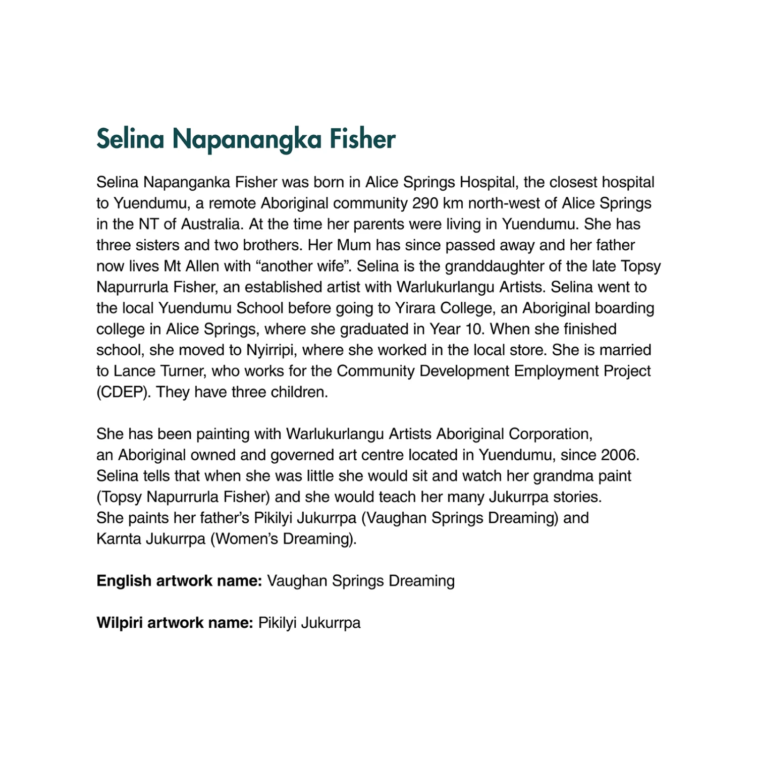 Vaughan Springs Dreaming is an original artwork by Selina Napanangka Fisher replicated onto our EDEN Indoor Cement Planters. Ideal for both indoor and patio settings, Our Planters not only tell a story about the Indigenous artists connection to their country but also make a unique addition to any home.